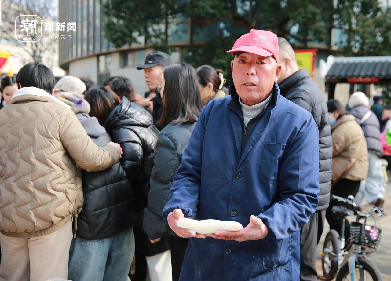 如今,很多年糕店已经用上了机器,于是传统石臼打出来的年糕成了稀罕物,臼打年糕技艺也被列入第三批嘉兴市非物质文化遗产名录。记者在现场遇到一位上海游客,她带着丈夫和上小学的孩子特地来桐乡赶集,吃年糕,她自从2023年来桐乡走亲戚尝过现打年糕以后,今年是第四次来,“这里特别有过年的氛围,每次都会带很多年糕回去。”
