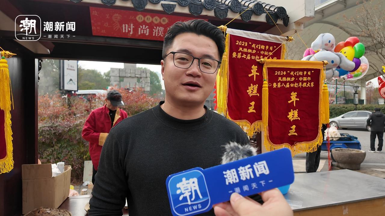 同样挂着好几面“年糕王”奖旗的还有濮院年糕队的展位,和崇福年糕队可谓旗鼓相当,但有一位打年糕的师傅却很年轻,在现场抡锤的老师傅里格外显眼。“我叫谢慧超,是濮院年糕队的领队。”他是队里最年轻的成员,只有32岁,“这位老师傅64岁,比我年长一倍。”他为记者介绍另一位老师傅。他说,濮院队的队员有更新,但是队伍一直保持稳定,虽然没有开年糕店的,可是大家都希望濮院能把这个传统和手艺传承下去。“我们年年都来参赛,年糕王也拿过七次了。”