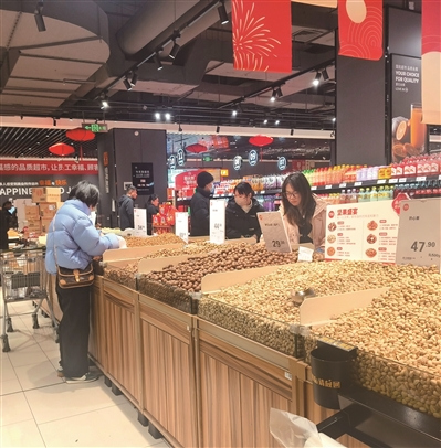 当晚,记者在永辉超市(衢州新城吾悦广场店)看到,坚果礼盒叠成小山,摆放在显眼位置,产品种类琳琅满目,“礼盒装我们已经卖了好几年了,适合送人。”一位工作人员表示,颜色喜庆、包装精美的坚果礼盒颇受欢迎,很多人都是几盒几盒搬上购物车。