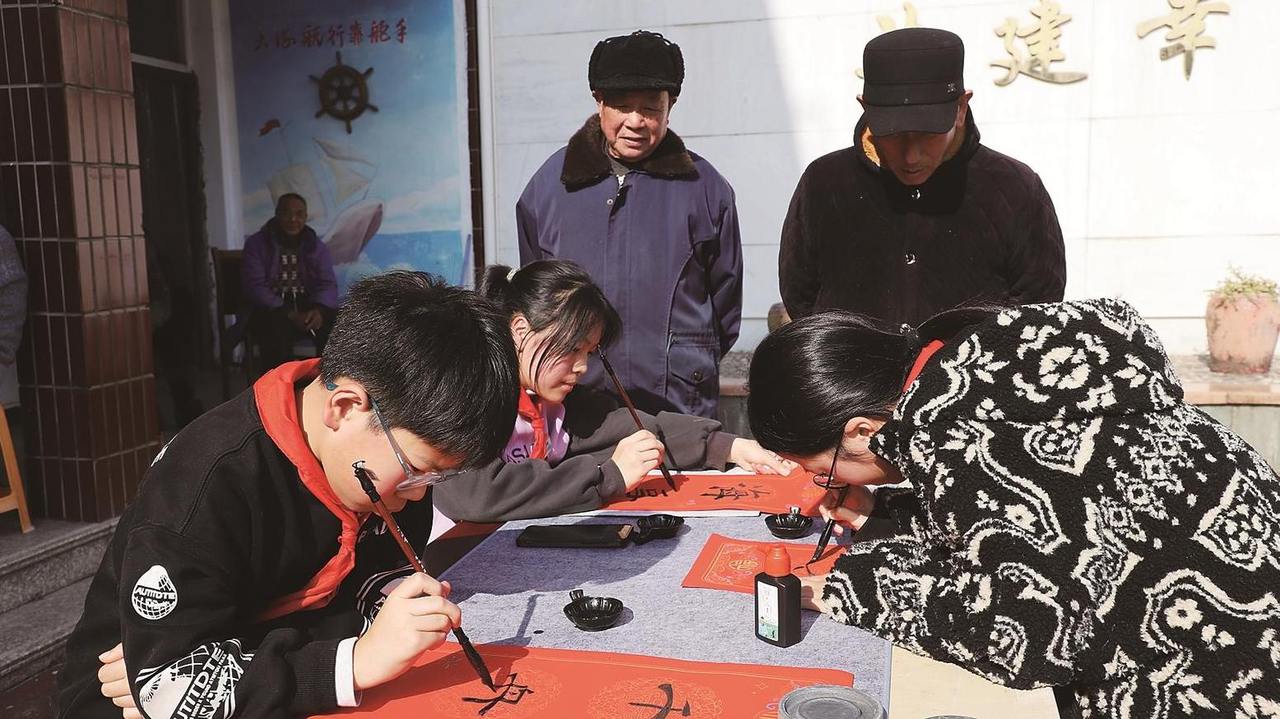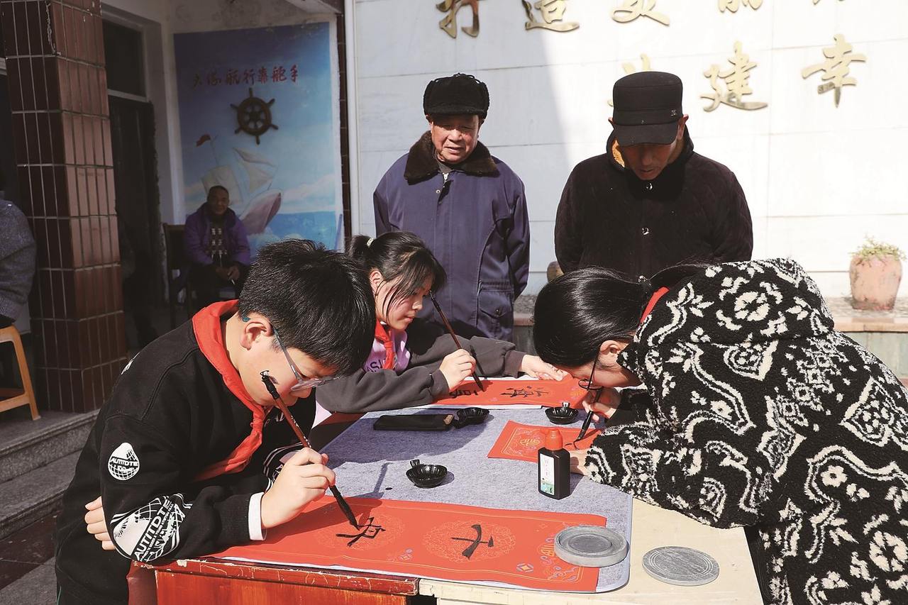 2月3日下午,温岭市松门镇石板殿村文化礼堂,学生们和温岭海事处工作人员一起拓印福字、书写春联。
