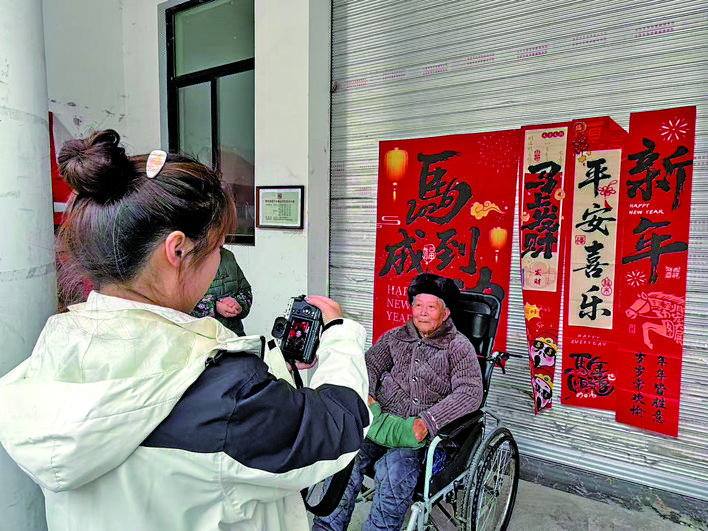 “阿公头再抬一点,笑得真精神!”镜头背后,周静雯半蹲着调整角度。作为磐安县人民医院的一名护士,她一下班就赶到村里布置拍摄现场——红彤彤的背景布、手写春联和窗花映着老人们腼腆又期待的笑容。