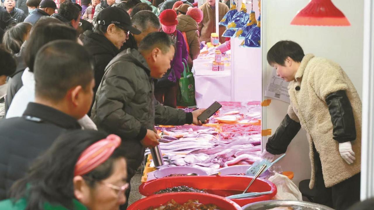 “上午带鱼就卖了200多斤,蟹糊更受欢迎。”老板娘介绍,蟹糊采用传统工艺制作,每年年货展都供不应求。“一瓶25元、两瓶40元,半天卖了200多罐。”