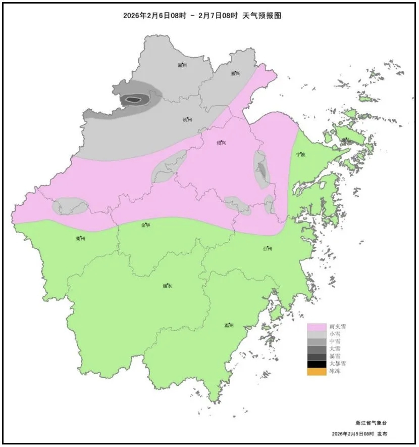 预计,今天中午起,浙北山区率先转雨夹雪或雪,部分中到大雪,高山区局部暴雪;下午起浙北部分平原地区有雨夹雪,傍晚起雨夹雪或雪。量级来看,浙北山区部分有中到大雪,高山区大到暴雪,浙西南山区局地还有冻雨。