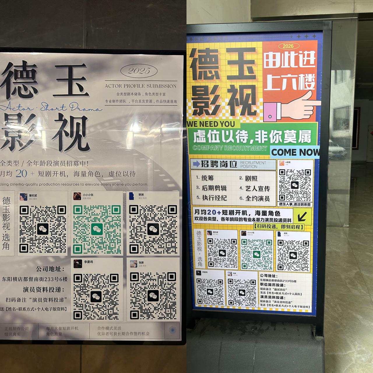 “统筹、剧照、后期剪辑、艺人宣传、执行经纪、全约演员……欢迎投递简历。”在德玉影视所在的商务楼入口及电梯间,均张贴着企业的招聘公告。