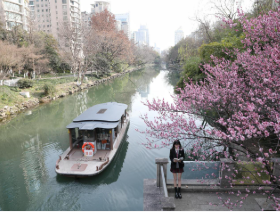 两岸梅花正盛、暗香浮动,古桥映影、绿植依依,游客们纷纷拿出手机记录美景,不时与同行人交流赞叹,沉浸式感受着良渚水网的独特魅力。