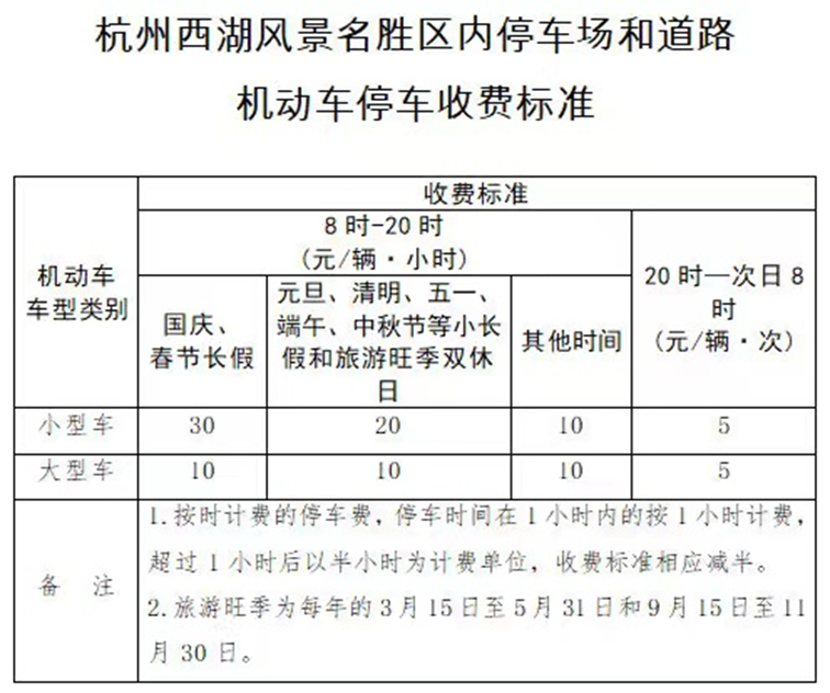 根据杭政办函〔2014〕101号文件规定,西湖风景名胜区政府定价停车场及道路泊位执行春节长假收费标准: