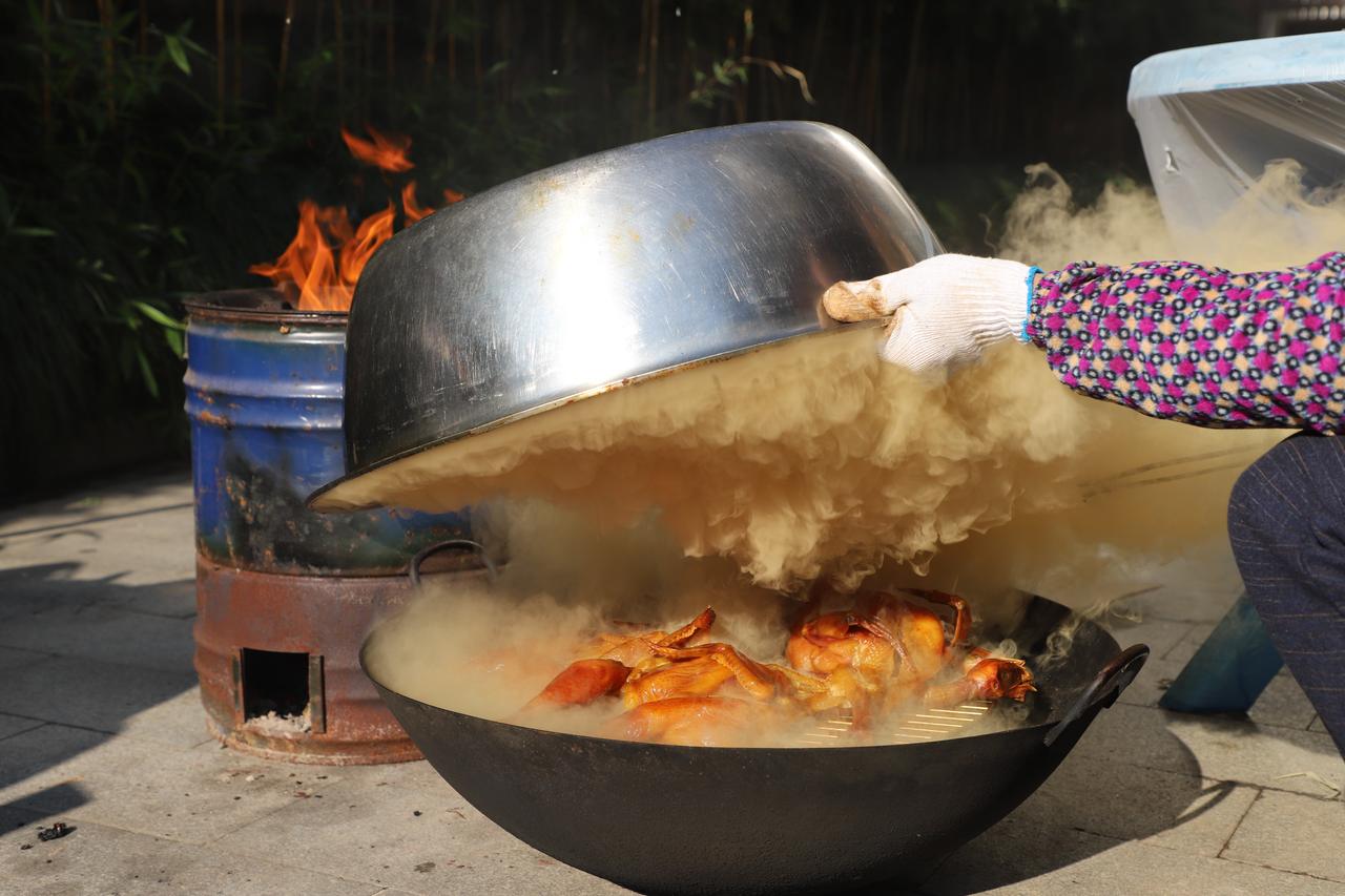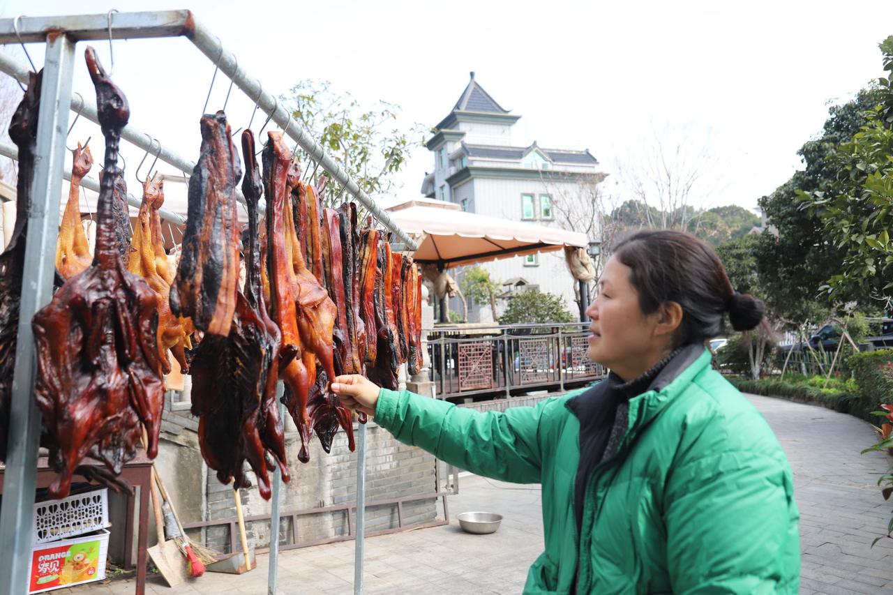 好天气也为销售添了助力。去年国庆之后持续晴暖,吸引不少游客到竹缘山庄喝茶用餐,见院中挂满熏鸡,尝过便成了客户,有人甚至专程从外地赶来,只为吃一口现做的年味。对严淑媚来说,熏鸡不只是商品,更是家的味道。“我们村里人过年,餐桌上一定有熏鸡、酱鸭、咸肉。”她特意留了几只自家享用,也为春节预订的客人预留了份额。