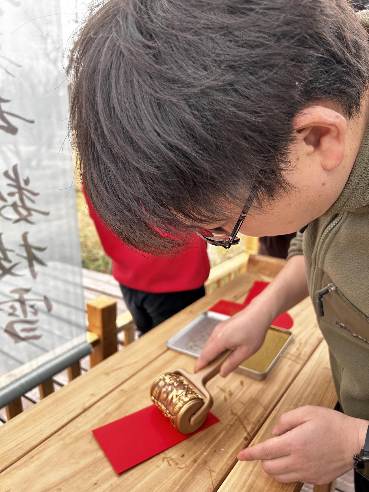 在拓印区,市民朱先正带着一家三口在体验。“好好印,别歪了!”看着孩子调皮地拿着滚轮在红纸上划过,他笑着接过工具,小心翼翼地推动烫金滚轮。随着滚轮划过,“马上有钱”四个金色大字跃然红纸上,喜气盈盈。