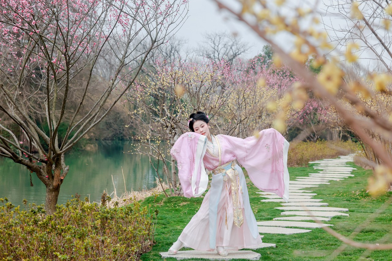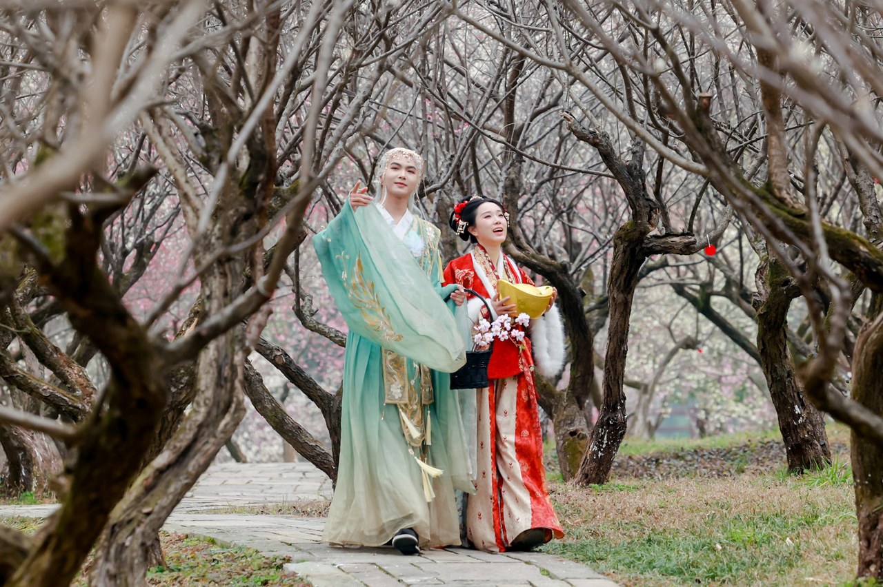 沿着梅林栈道前行,一阵悠扬的国乐突然从梅林深处传来。循声而去,竟偶遇了传说中行踪不定的“梅仙子”。她身着古装长裙,在梅林间随音乐翩翩起舞。游客纷纷驻足,举起手机定格这一刻。舞罢,孩子们围上去,与“梅仙子”嬉戏互动。