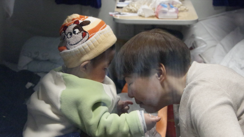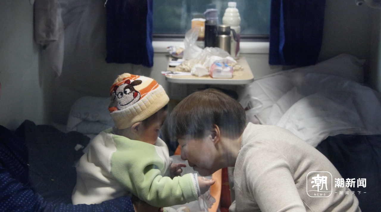 K465次列车车厢内,上演温馨一幕,长辈逗小娃娃玩。 王志杰 摄