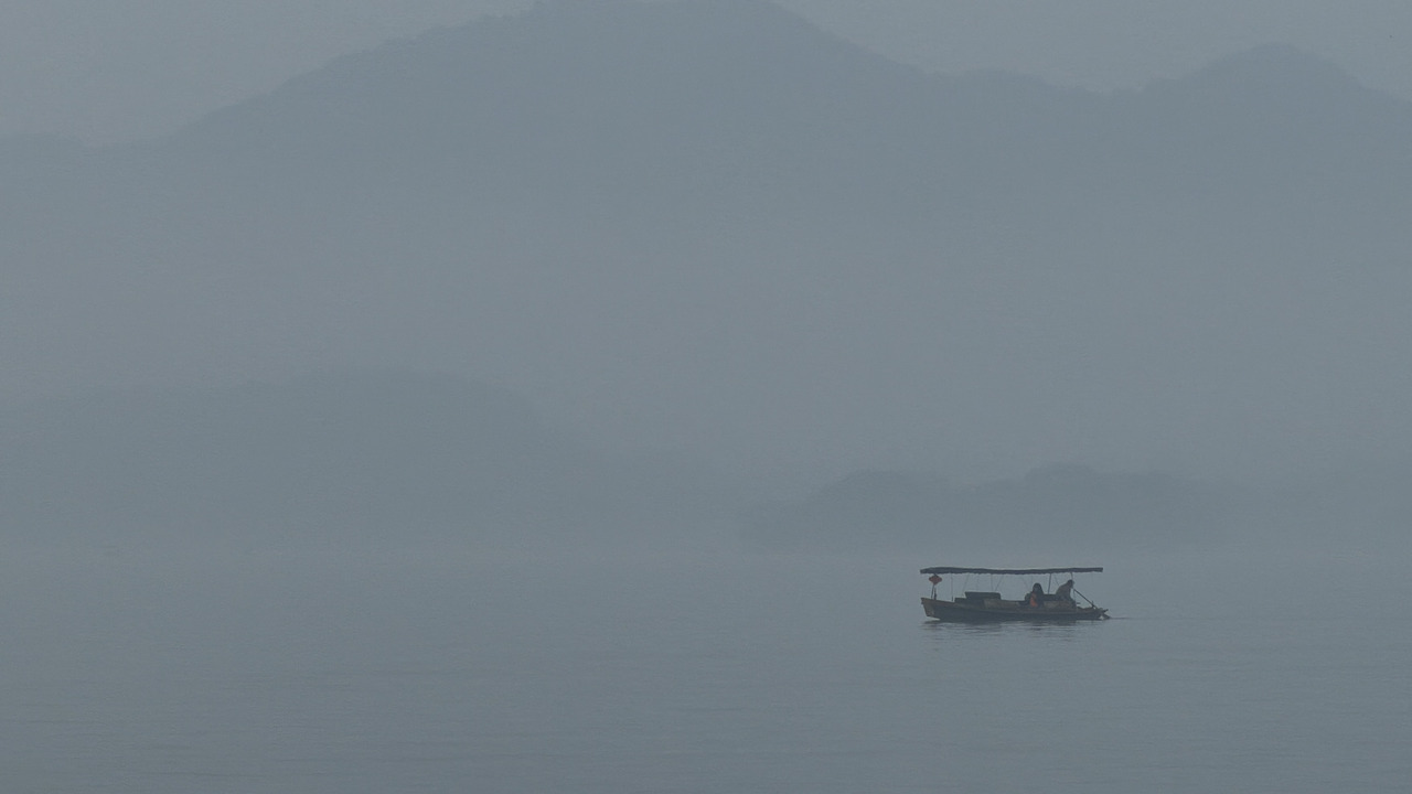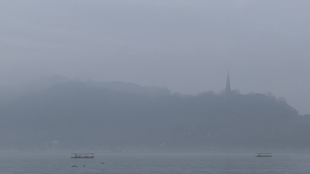 杭州西湖今晨薄雾缭绕,游船穿梭其间,勾勒出一幅灵动的江南水墨画卷。