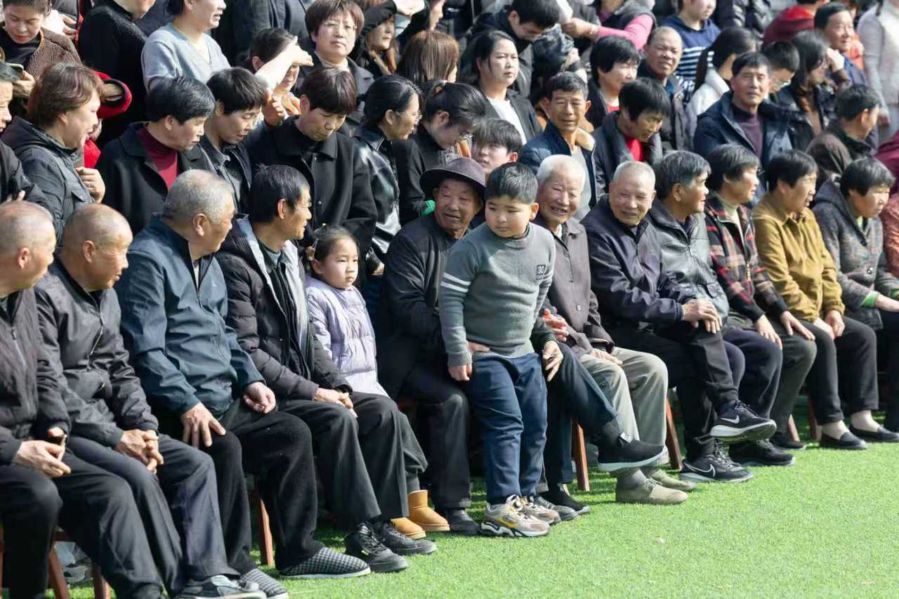白发长者与稚嫩孩童并肩,久别重逢的乡亲双手紧握,一张全村福,定格了山村难得的热闹与温情。