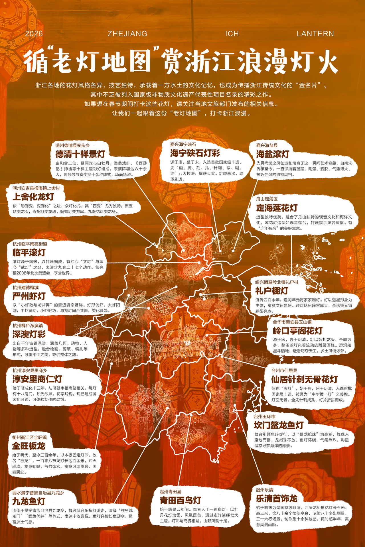 浙江各地的花灯风格各异,技艺独特,承载着一方水土的文化记忆,也成为传播浙江传统文化的“金名片”,其中不乏被列入国家级非物质文化遗产代表性项目名录的精彩之作。让我们一起跟着这份“老灯地图”,打卡浙江浪漫。