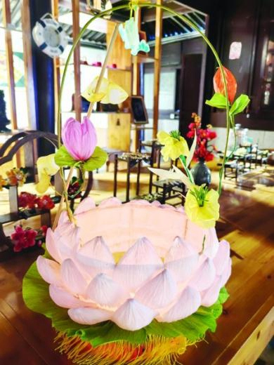 造型独特优美,融合了舟山独特的观音文化和海洋文化。莲花灯造型如观音莲台,竹篾提手宛若鱼篮。匠人常在灯面贴上手绘黄鱼,让整体造型更灵动,也更有渔家风情,且有“连年有余”的美好寓意。