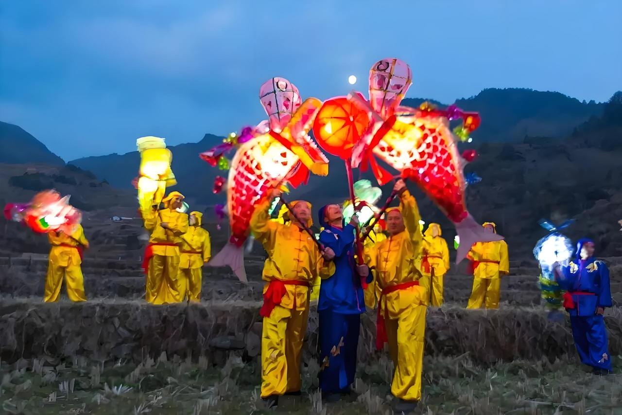 流传于景宁畲族自治县九龙乡,据传已有千年历史。舞者随锣鼓唢呐声挥灯游走,演绎“鲤鱼跳龙门”“鲤鱼伏井”等阵式,表达丰收喜悦。鱼灯穿梭如鱼游水,极富乡土气息。