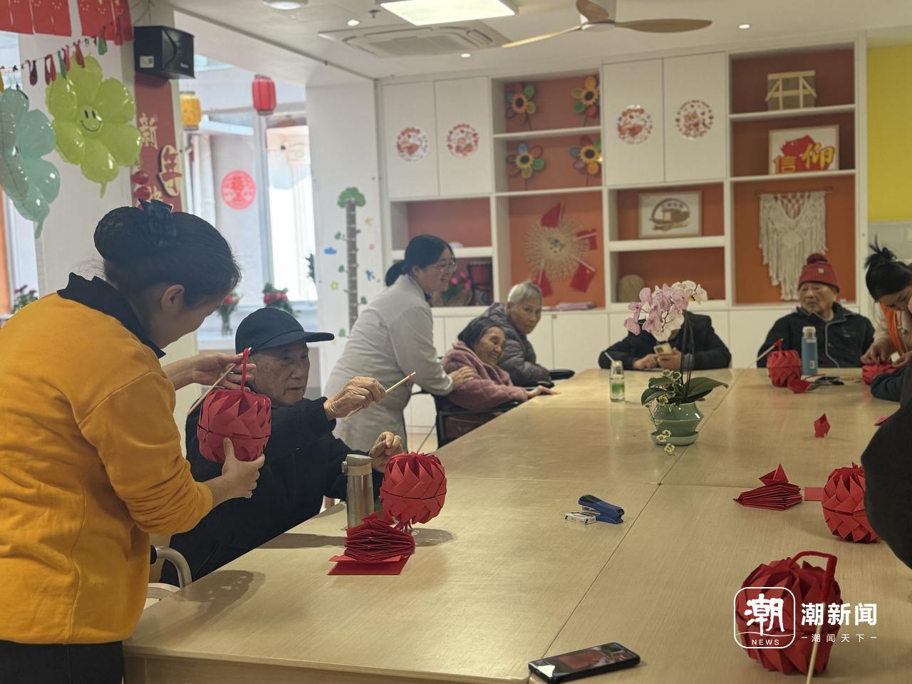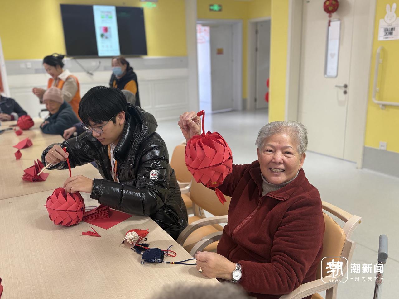 杭州绿康丁兰家园,护理员、社工、志愿者与老人共同制作红灯。记者 王逸群 摄