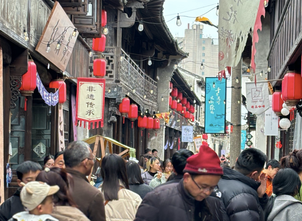 浙江在线2月20日讯(记者 夏菁)大年初四,记者走进桐乡市崇福镇的横街,感受古街上的“年味儿”。这条仅354米长的鱼骨状老街,形成于宋元。今天,当“妈妈的味道”“新春集市”的幡旗在街口高高挂起,油锅里的滋啦声、蒸笼里的噗噗声、商贩的叫卖声、孩子们的欢笑声,交织成鲜活的新春画卷。