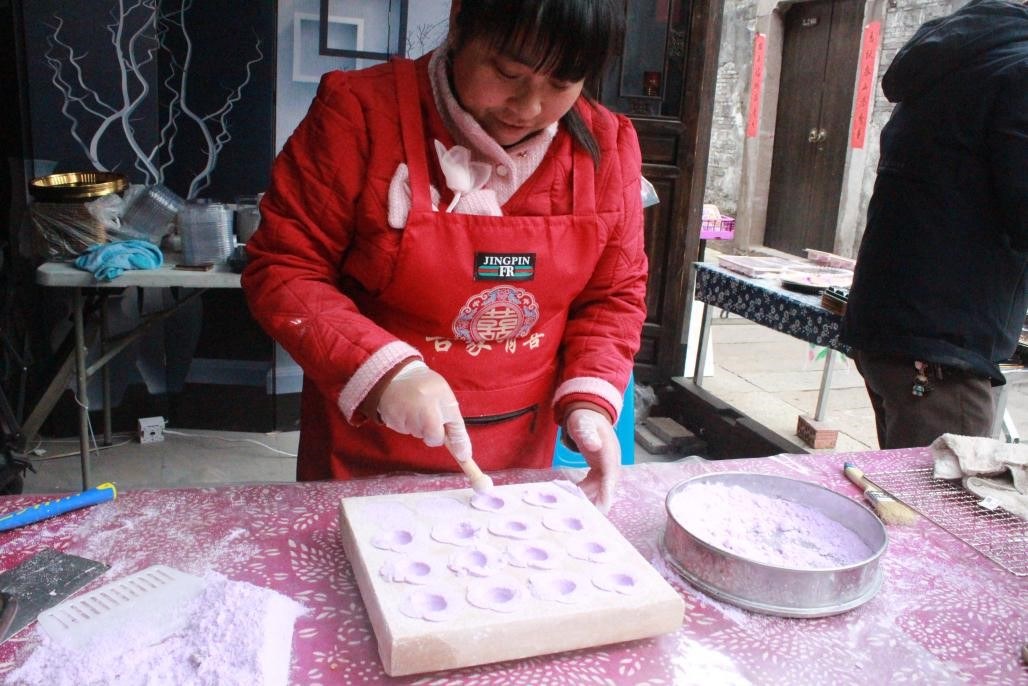 据沈老板介绍,制作一块糕点至少要经历六道工序,淘米、磨粉、过筛、裹馅、压形、蒸制。春节期间,店里每天要做200余盒,有6块装、8块装等多种规格,每盒糕点售价在18到36元之间,紫薯味的定胜糕最受欢迎,有时候忙不过来还要雇帮手。
