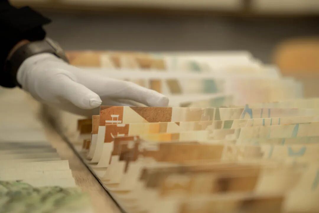 张毅说,龙鳞装书卷的特色之处,就是拉开卷轴之后,书页向左卷是一幅画面、向右卷则是另外一幅画面。“要让画面精准呈现,就要保证折页时对书口拼缝的误差不能超过0.1毫米。而这都得靠手工和眼力。”