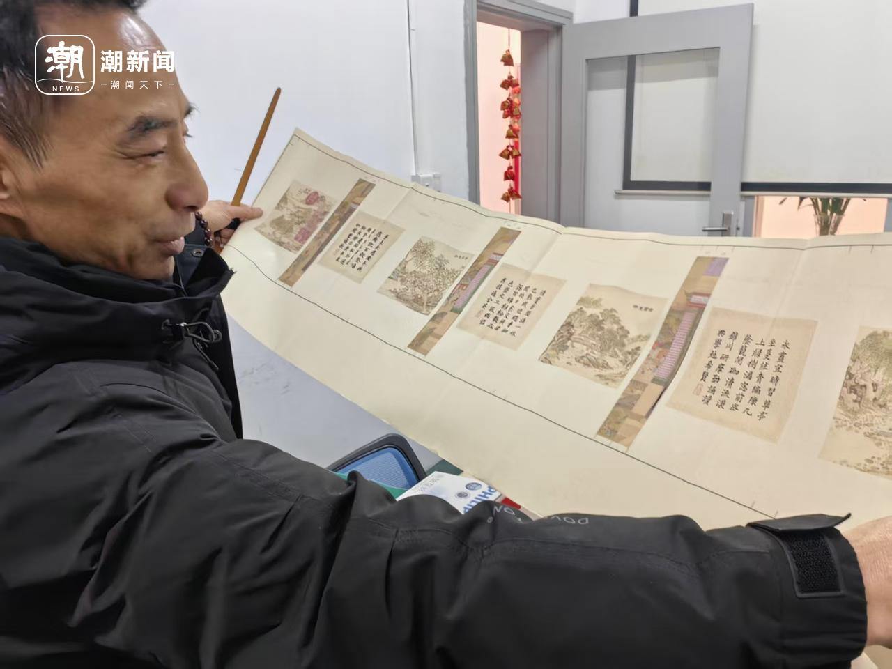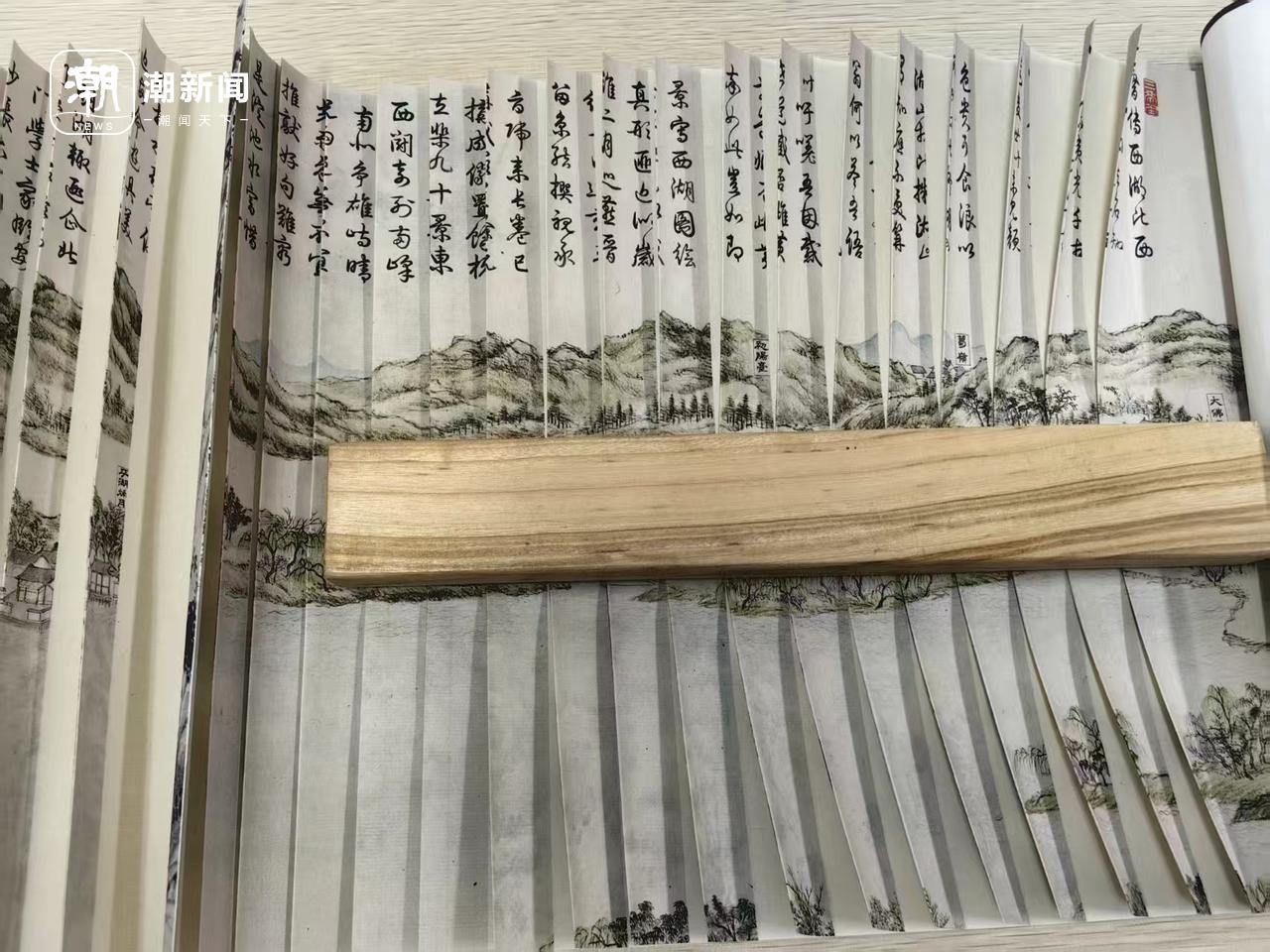 在他的工作室内,张毅拿出一卷西湖山水的龙鳞装作品展示给记者看。“左翻是西湖山水图,右翻则是富春山居图。”张毅说,水墨画的书口拼缝有些误差可能还看不太清楚,但书法字如果误差太多,一眼就能看出来。他做过最长的一幅作品,也是一卷西湖山水龙鳞装,“5米长,内页就有300多页。”