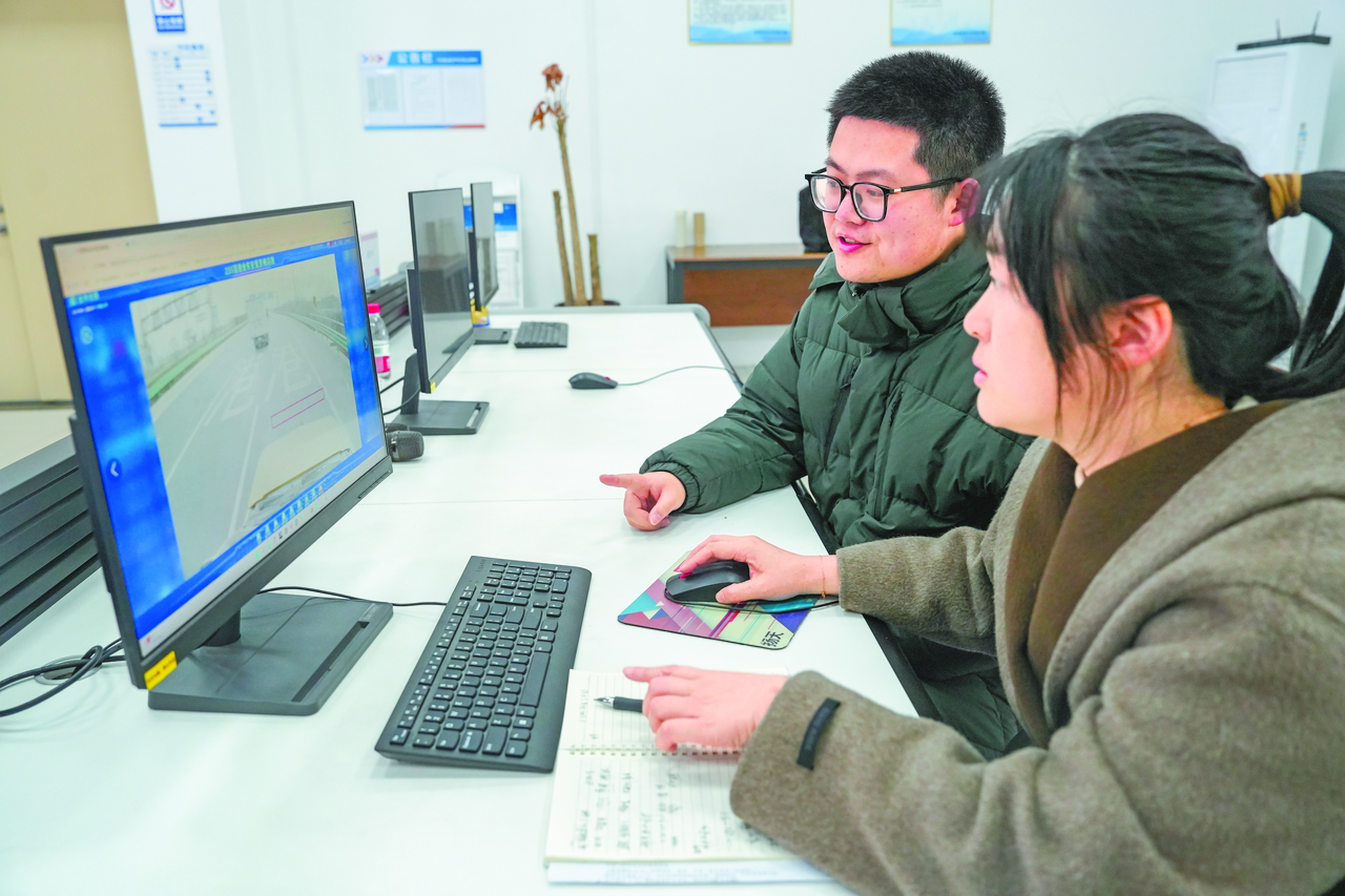 记者(右)在工作人员指导下处理巡检发现的道路病害。 共享联盟·金东 胡赣昌 摄