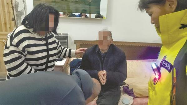 仅仅20分钟后,好消息传来。在一户邻居家的屋檐下,老人蜷缩着身子,冻得瑟瑟发抖,眼神里满是无助。队员们轻轻扶起老人,一路护送回家后,赶紧帮他取暖、吸氧。看到老人平安无事,家人悬着的心,终于放下。