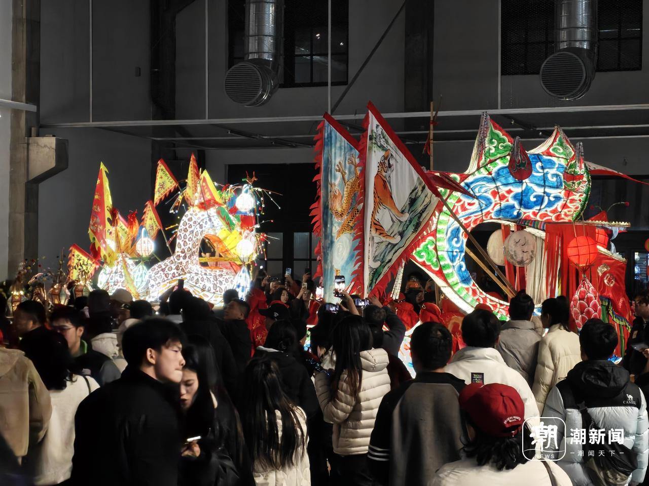 走进园区一个个老厂房,非遗元素和江南韵味的环境布置,仿佛置身宋时上元画卷。来自金华磐安的省级非遗“岭口亭阁花灯”安卧其中。