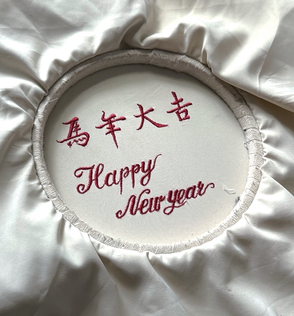 桌上有块布,上面绣着各式图案,章大姐说,这些都是她手画好后,用机器绣上去的,有云朵、小猫、四叶草、花朵、小鸟,还有一幅精致的“马年大吉”汉字、英文刺绣等,顾客可以选择,也可以在网上自己找喜欢的图案。