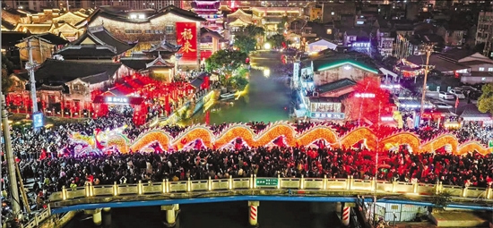3月3日晚,在温州市瓯海区梧田老街,“梧田五花寻年味 老街烟火庆元宵”主题活动热闹上演。图为55米长的龙灯巡游。 记者 王艳琼 共享联盟·瓯海 张心怡 许文星 摄