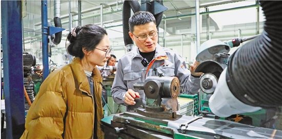 记者在姚红飞(右)指导下学习钻头生产。 记者 阮西内 摄