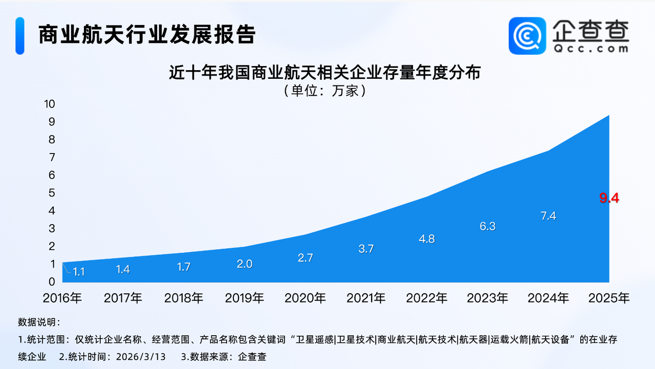 企查查数据显示,2025年全年,我国商业航天相关企业注册量同比增加54.8%至2.57万家,创近十年注册量新高。其中2020年以来,浙江省商业航天相关企业注册量逐年增加,2025年全年注册量同比大幅增加61.2%至1048家,创近五年注册量及其增速双高峰。截至3月13日,2026年浙江省已注册169家商业航天相关企业。