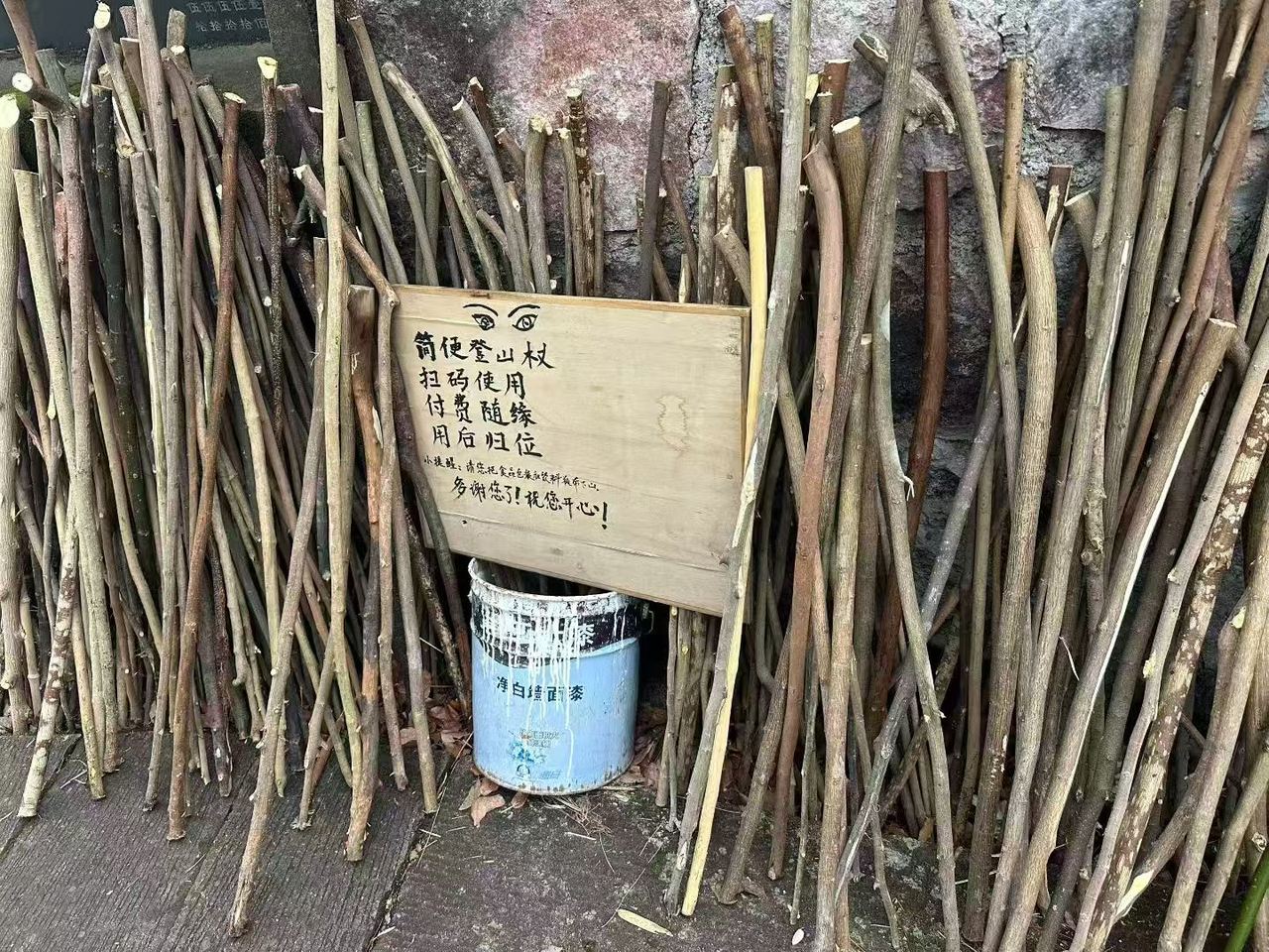 如何让游客们更轻松?2025年春节,周国成率先在山脚放置首批爱心拄杖。这些拄杖的都是他在散步时捡拾的、他人砍柴后留下的笔直柴木,再经过自己的改造和打磨制作而成。