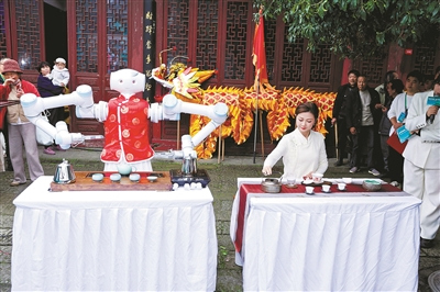活动主会场内,国风舞蹈《马踏山河》率先登场,刚柔并济的舞姿尽显东方气韵。随后的“智叙茶源”环节,将传统与现代的碰撞拉满:智能泡茶机器人以精准温控复刻标准化冲泡,茶艺师则用行云流水的工夫茶艺与西湖龙井“对话”。“机器人泡茶很新奇很有趣也很精准。”游客李先生一边品茶,一边笑着与机器人合影,“这几天在各个茶村逛得尽兴,等春茶大量上市,准备带些回去当伴手礼。”