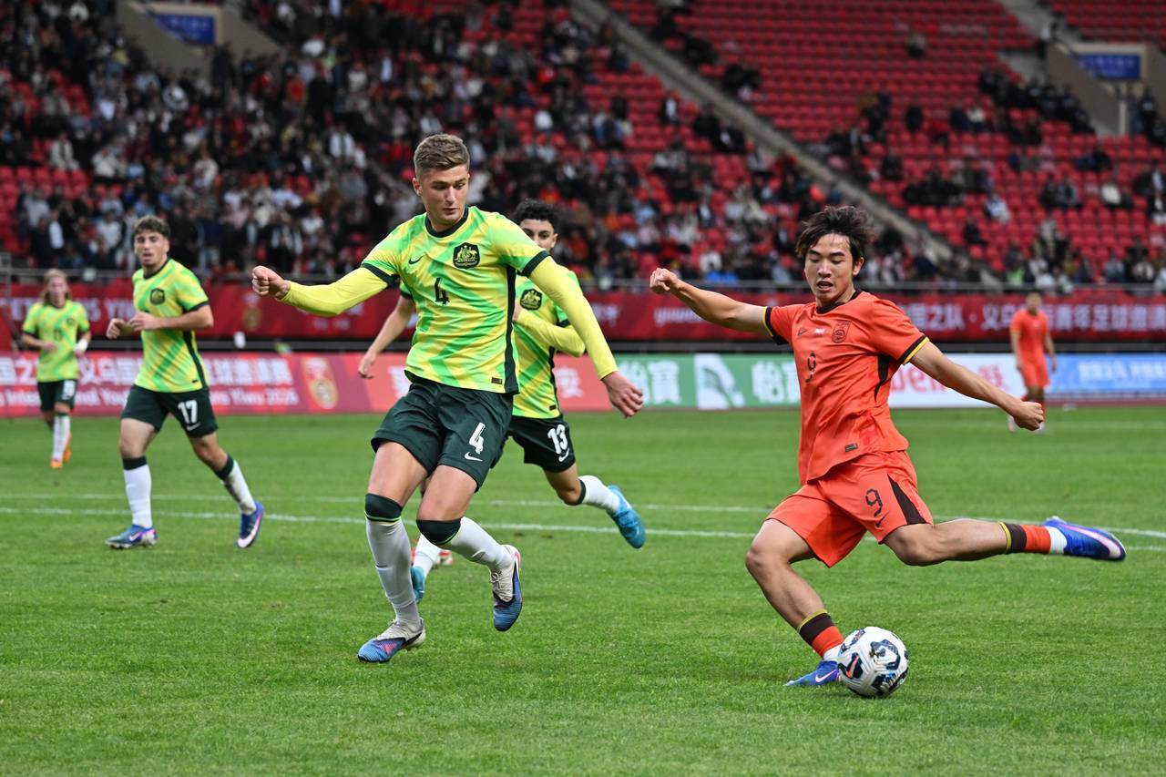 3月28日下午,浙江义乌市梅湖体育中心体育场,2026CFA中国之队·义乌国际青年足球邀请赛正式开赛。中国U-19国家男子足球队队员(橙色球衣)正奋力劲射。