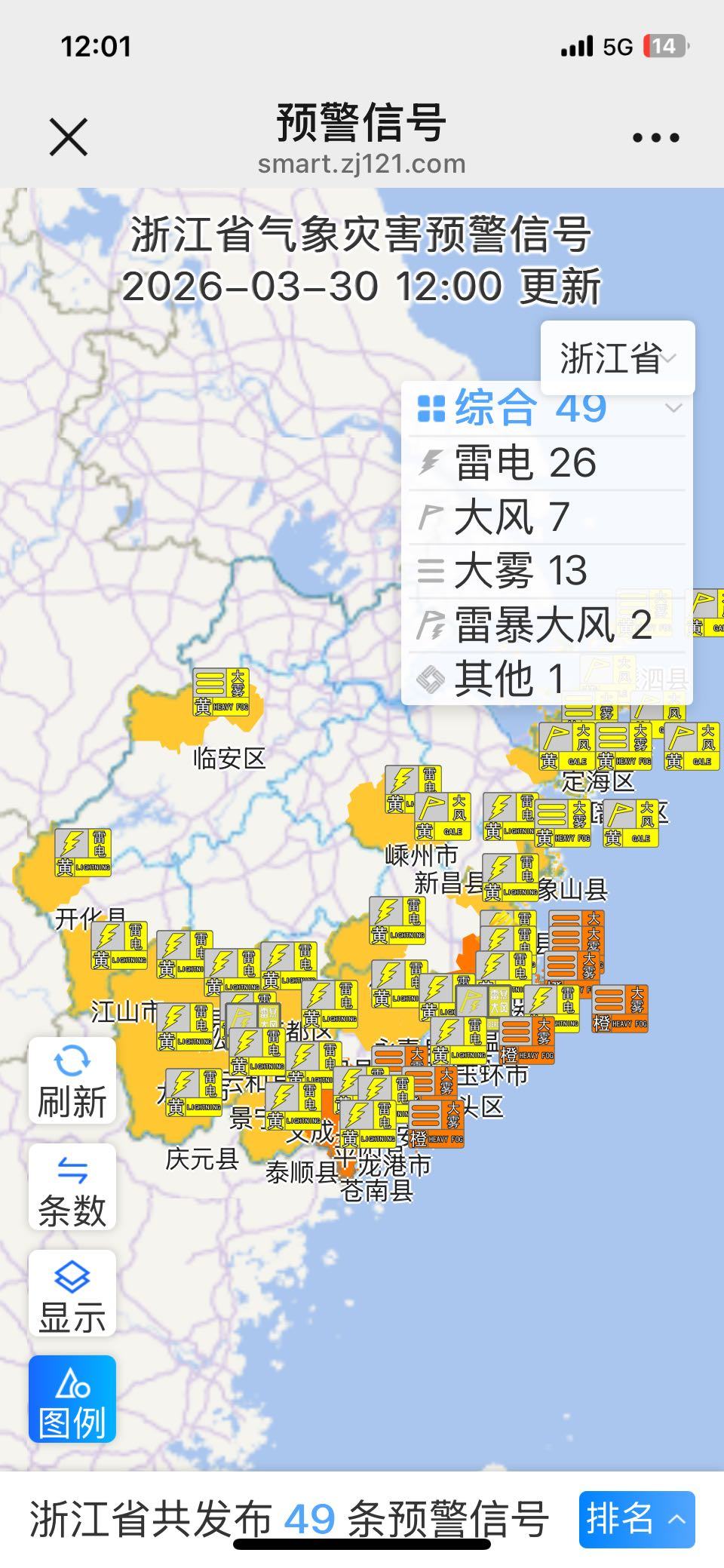 目前,有27个县市区发布雷电黄色预警信号,7个县市区发布大风黄色预警信号,2个县市区发布雷暴大风黄色预警信号。