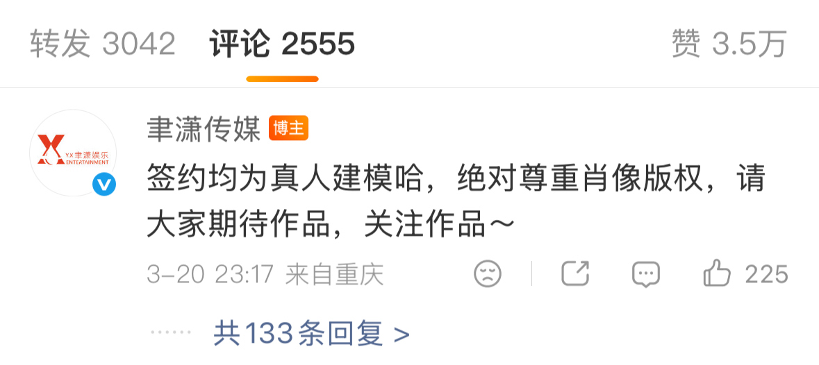 聿潇传媒在评论区表示:签约均为真人建模,绝对尊重肖像版权。社交媒体截图
