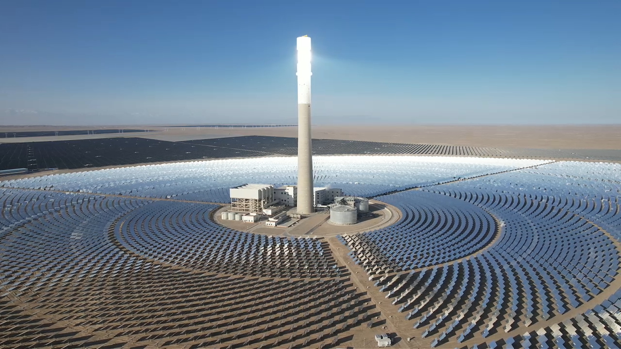 这里,是位于甘肃省酒泉市金塔县的“中光塔式光热电站”,该电站是国家第二批“沙戈荒”大型风光基地项目,浙江可胜技术股份有限公司是该项目核心技术和设备供应商。电站共布设25594面定日镜,每块镜面面积30平方米,组成的“镜子海洋”总面积超过76万平方米。