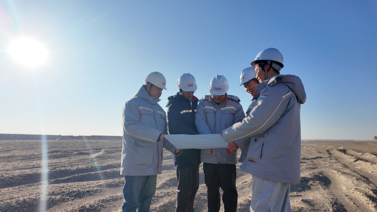 金塔中光太阳能项目部现场负责人周发源(中)和工程师们讨论设备检修方案。受访者供图