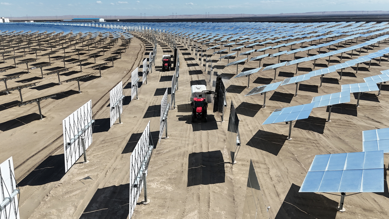 “风大的时候,定日镜是平躺的,这样风沙对镜面和机械部件的损伤越小。”他指着远处一排倾斜的镜子说,“你看那些立起来的定日镜,风沙吹过来顺着镜面就滑落了,不容易积在表面。如果下冰雹,我们也会把镜子立起来,冰雹就砸不到镜面了。”