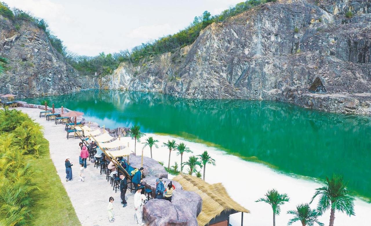 碧绿湖水、细软沙滩、茅草小屋以及充满异域风情的绿植……近段时间,上虞区东关街道金鸡山村的废弃矿区,变身为充满东南亚风情的文旅项目,正式开张营业。众多游客慕名而至,尽享别样风景。