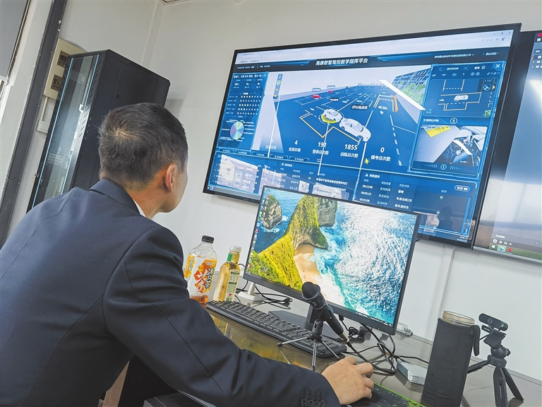 长运鹿山驾校中控室内,教练孙利冬远程监管AI教练车。记者 董梁 摄