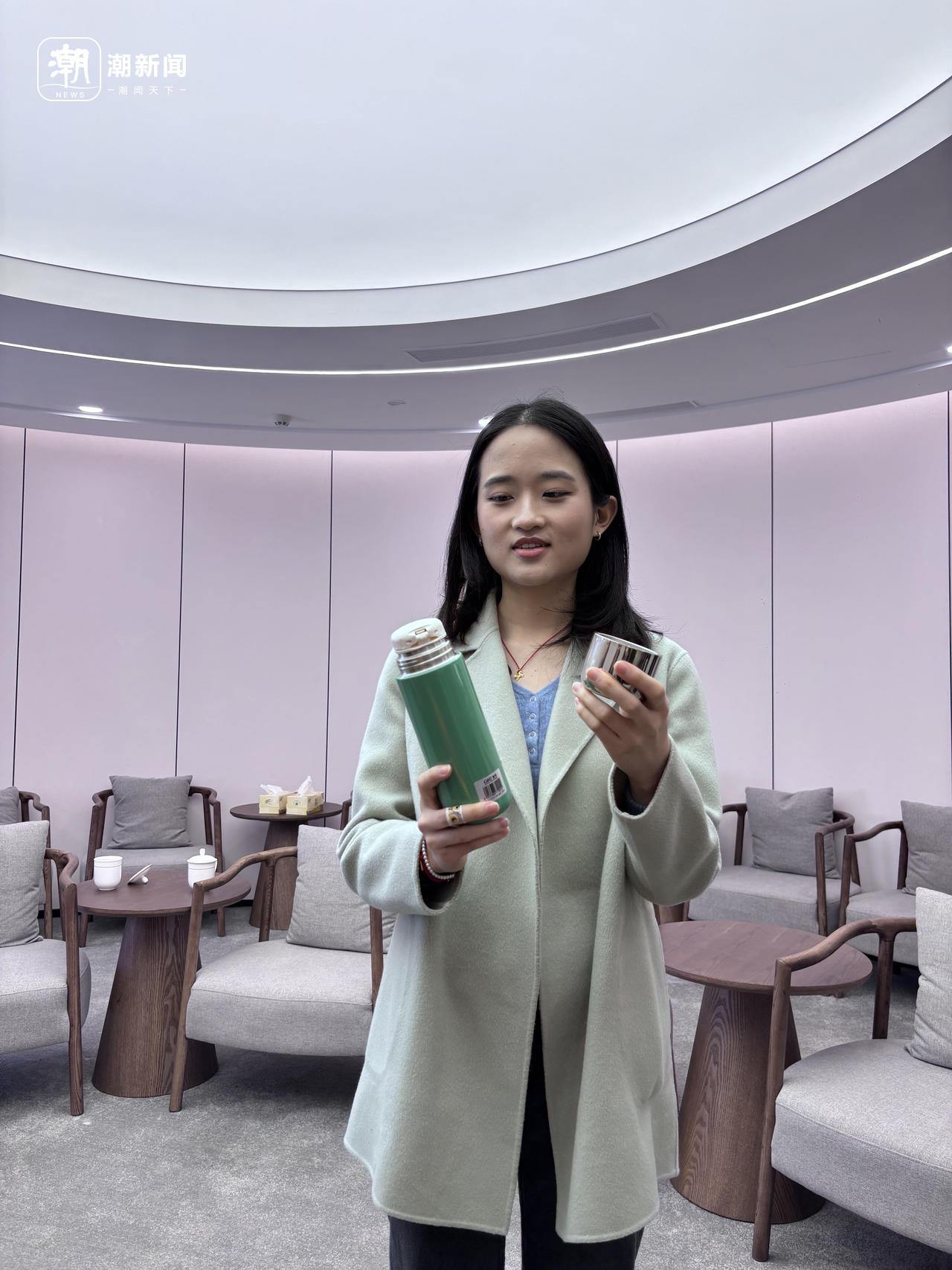 朱溪瑞在平湖老家获赠了一个非常“有梗”的礼物——喝热水用的保温杯。 记者 陈黎明 摄