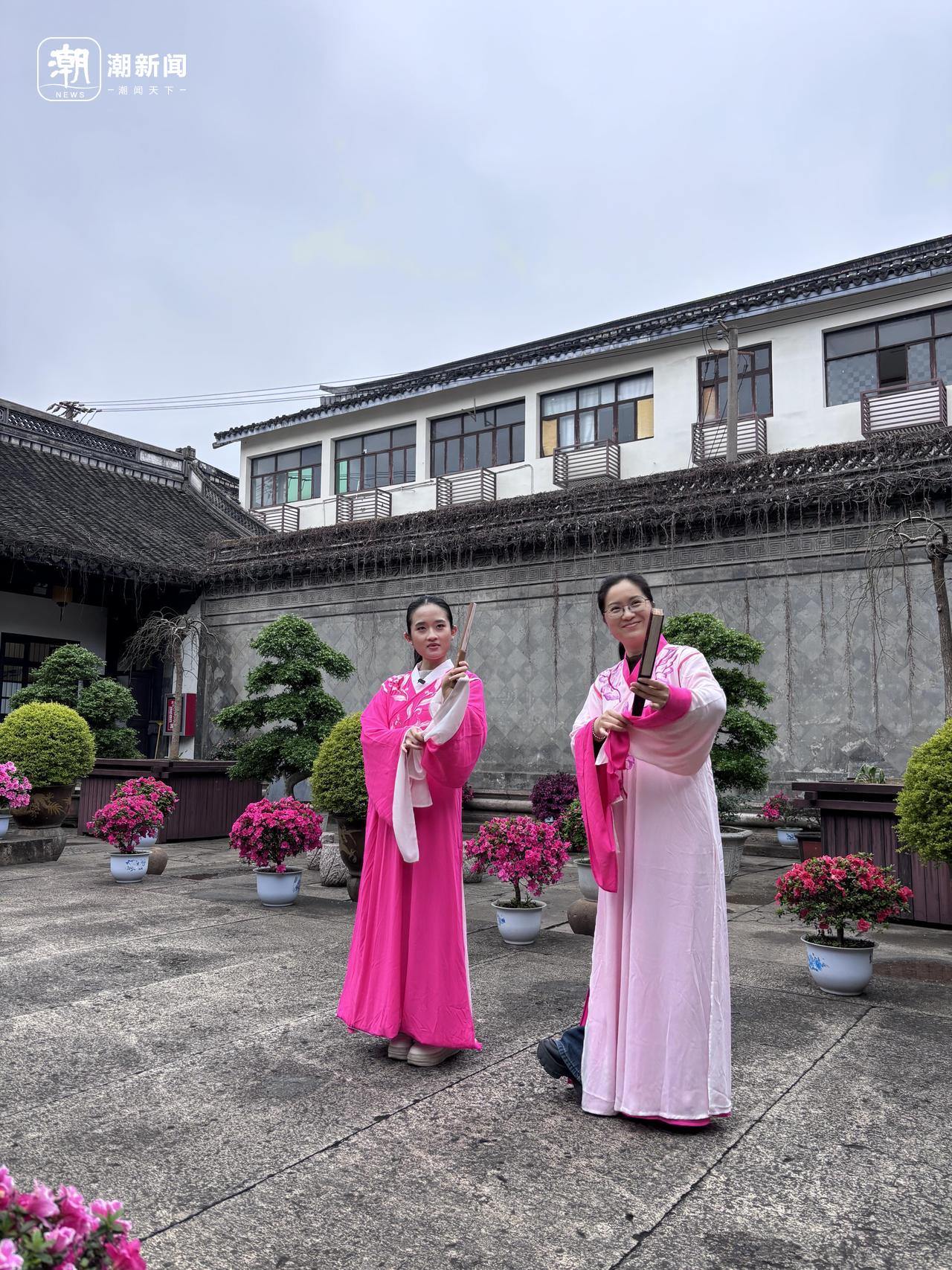 “书房门前一枝梅,树上鸟儿对打对……”一手捏水袖,一手持折扇,眼神跟着扇子,顺着扇子指引的方向看去,反复吟唱。在绍兴布业会馆旧址前院,身着一袭戏服,朱溪瑞跟着绍兴市越城区文化馆工作人员叶月芳,学起了越剧《梁山伯与祝英台》选段《十八相送》。