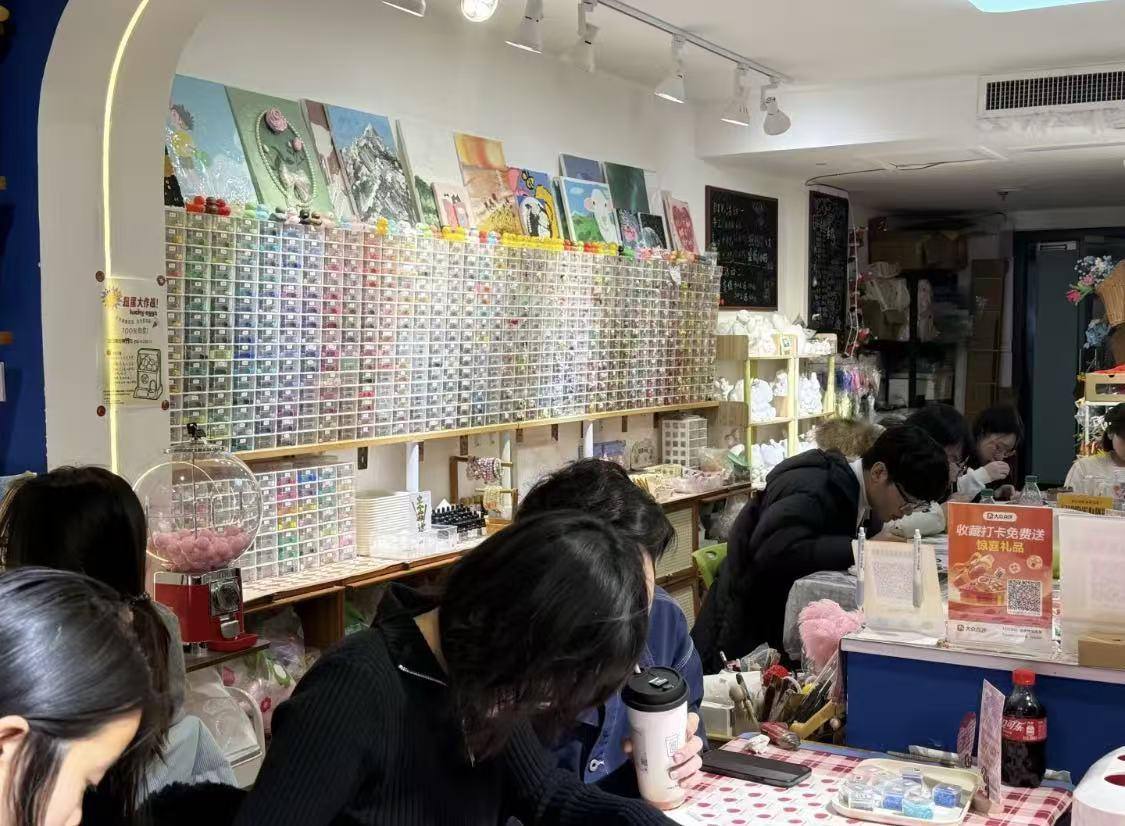 在杭州龙翔桥商圈的一家拼豆店内,年轻人坐得满满当当。受访者供图