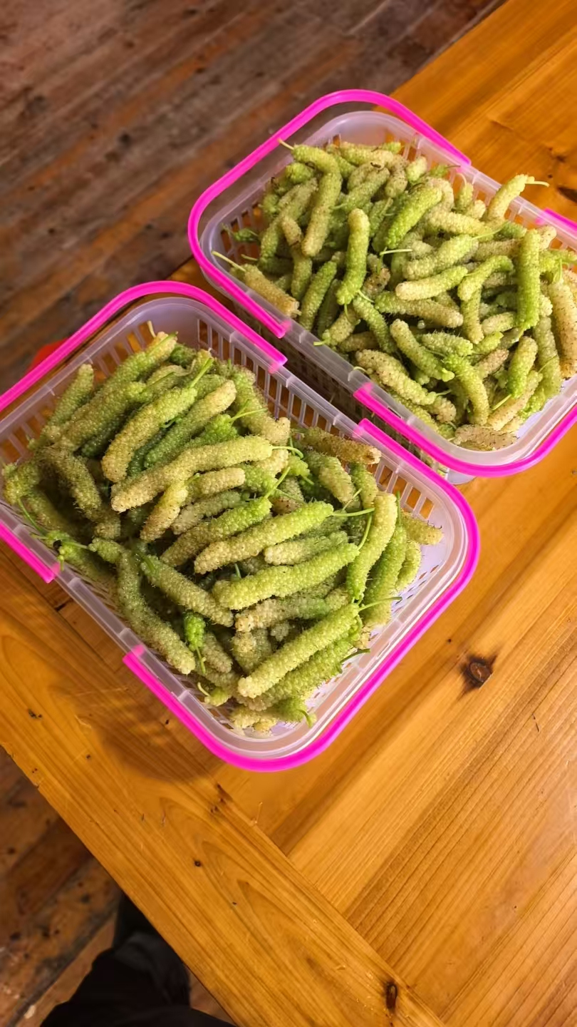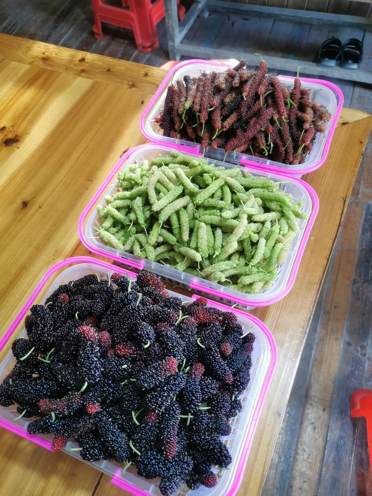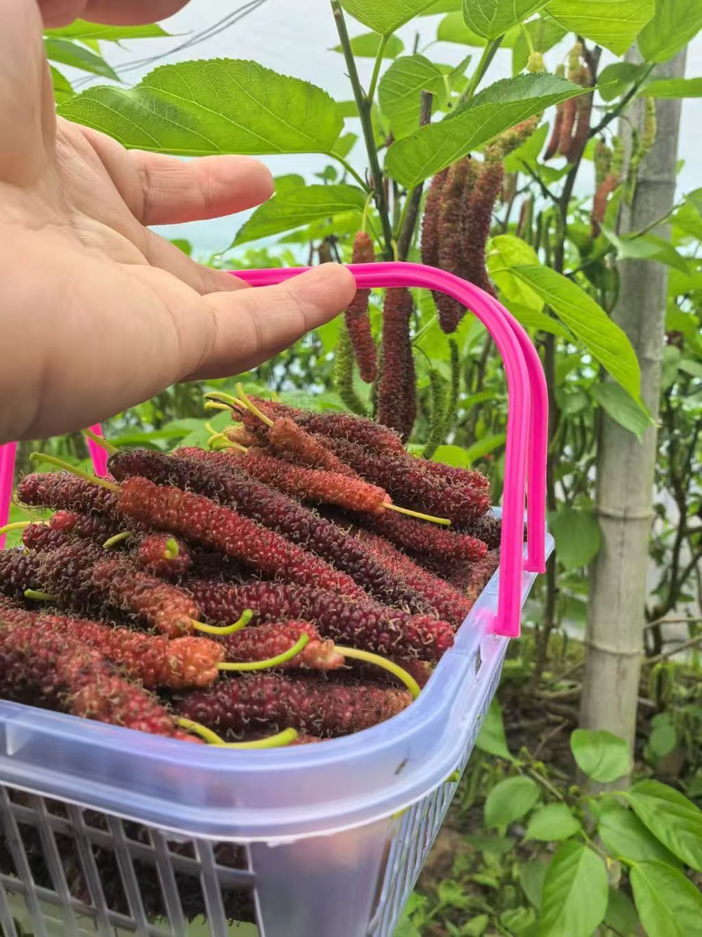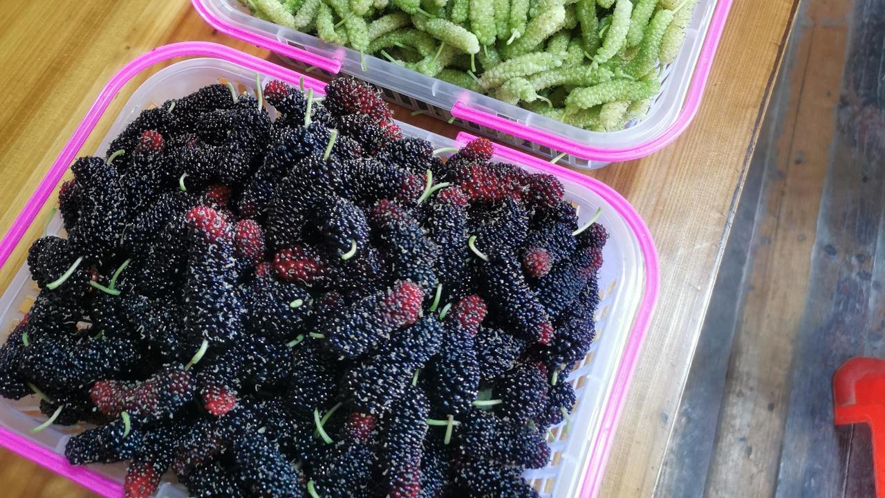 这种源自巴基斯坦的白色桑葚,虽然目前还在小规模试种阶段,却被项财根称为“桑葚界的天花板”。“它的口感自带奶香,甜得像蜂蜜一样 。”项财根指着那几棚黄金奶桑说,“它的产量相对较低,但我准备再扩大种植。”
