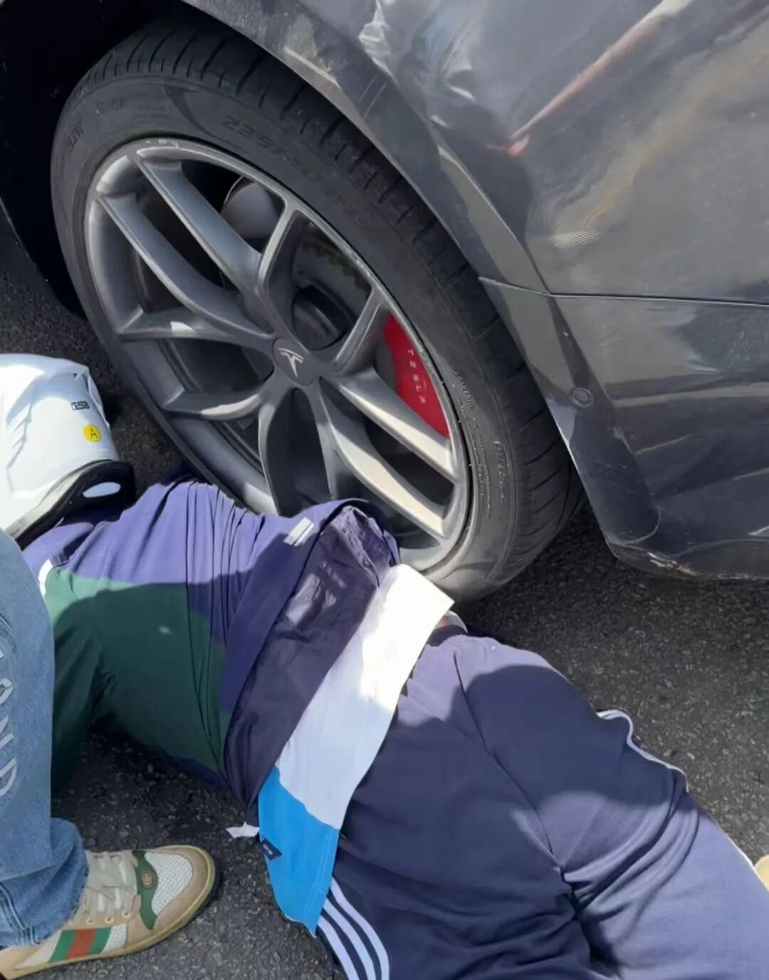 突然“嘣”的一声巨响,学生连人带衣被卷进入特斯拉后轮下,趴在地上动弹不得。所幸,他的身体并未被车轮压住,只是衣服卡在轮胎下,无法挣脱。