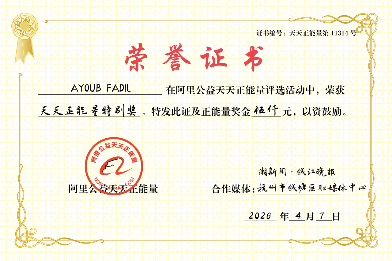 4月7日下午,阿里公益天天正能量联合潮新闻·钱江晚报、杭州市钱塘区融媒体中心,向摩洛哥在华留学生AYOUB FADIL(中文名“尤博”)颁出“天天正能量特别奖”。
