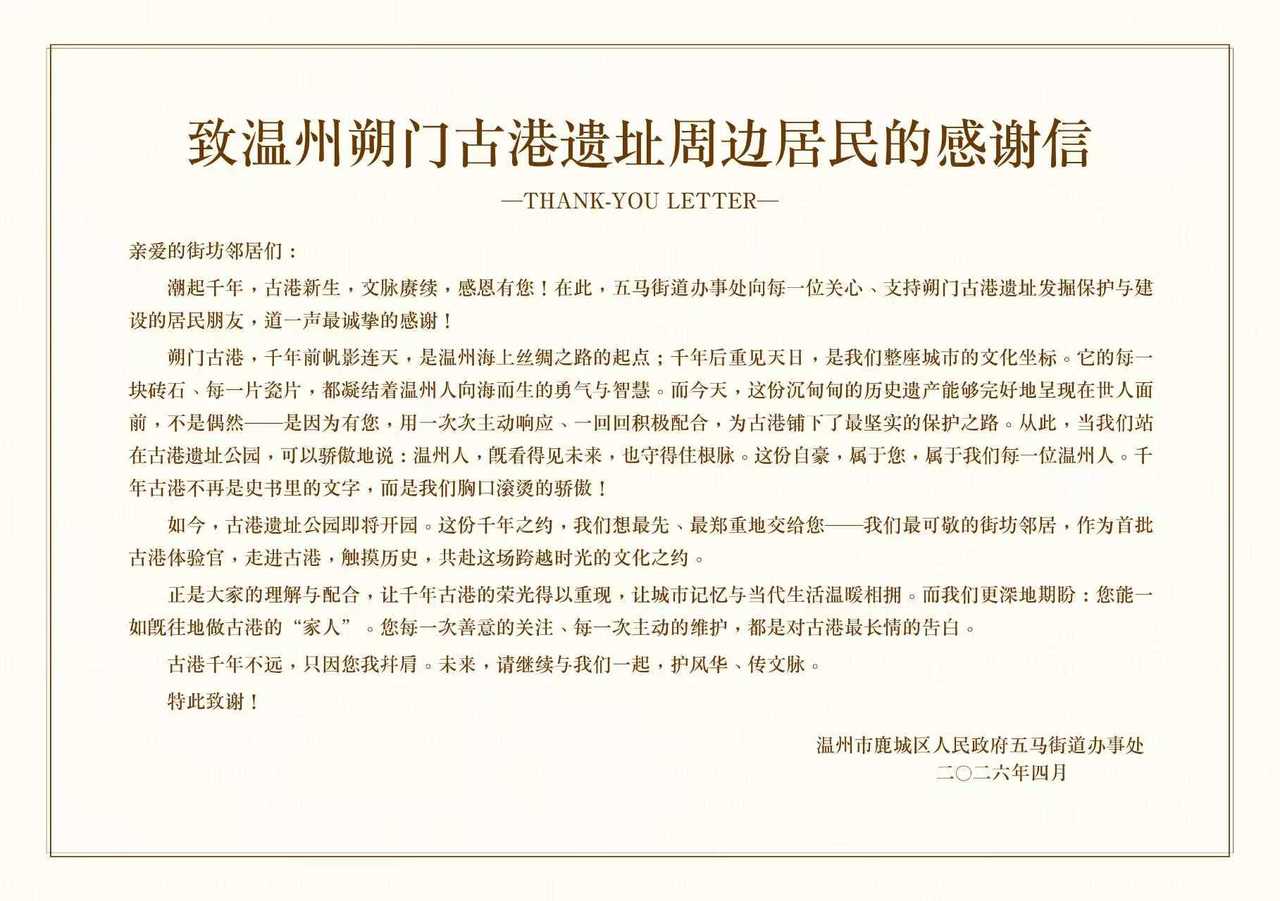 “回家了,回家了。”4月10日下午,站在修缮一新的朔门街老屋前,在老街生活了五十余年的姜顺福,一遍遍呢喃着,难掩心中的激动。在朔门古港考古遗址公园即将正式开放前,遗址所在的鹿城区五马街道特地发出感谢信,并邀请遗址周边80名住户及商户代表担任首批体验官,提前走进朔门古港,近距离感受千年港埠的历史底蕴,共赴一场跨越时空的文化之约。
