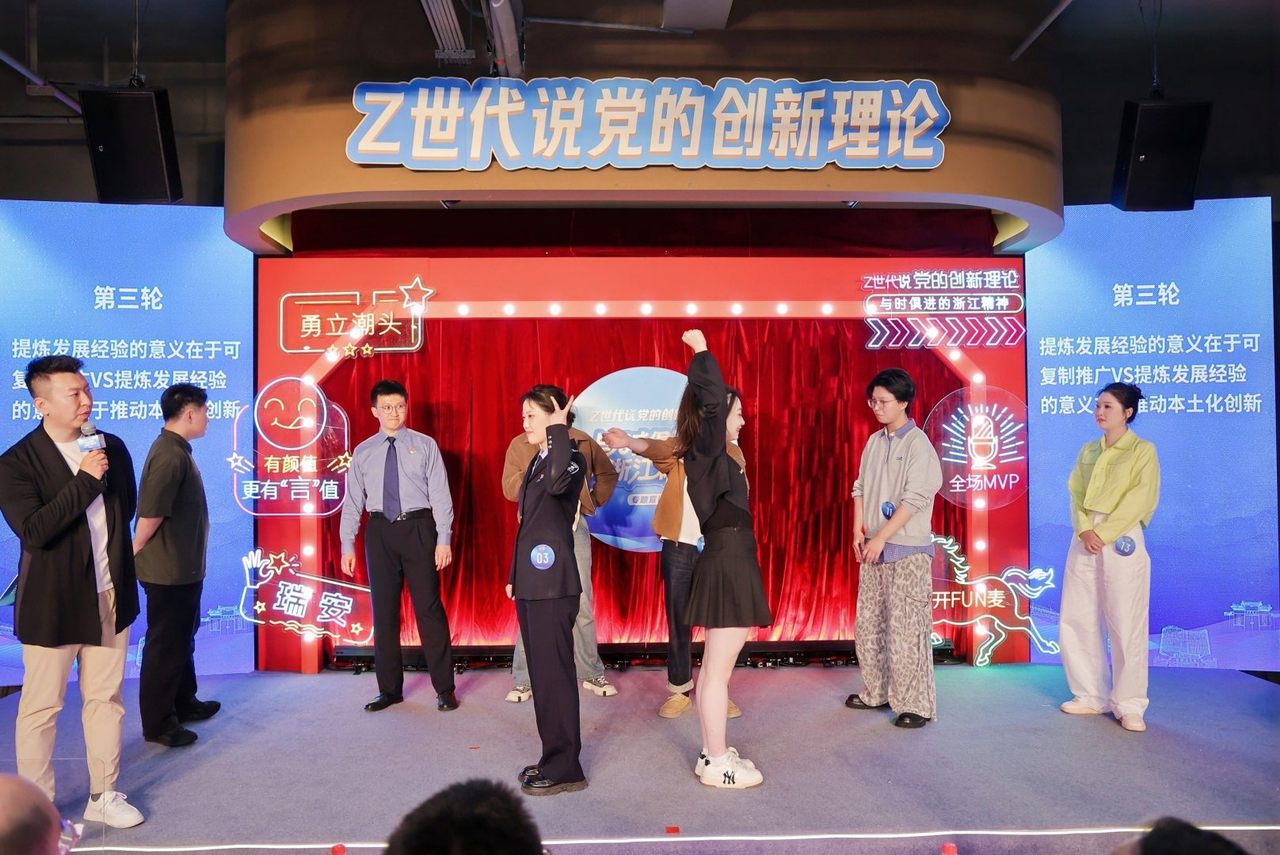 4月10日,“Z世代说党的创新理论——与时俱进的浙江精神”专题宣讲抢麦活动在瑞安举行,晋级PK脱颖而出的15位宣讲员,上演了一场巅峰对决。青年是如何为理论“代言”的?开放麦宣讲又是如何整活让理论活起来的?抢麦、辩论、热点评述,宣讲员来了一场理论版的“极限挑战”。