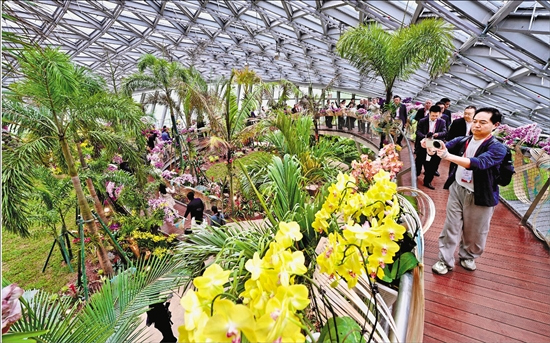 4月15日,游客在温州园博园南园的葳蕤馆观赏各类植物。 本报记者 徐彦 林云龙 摄